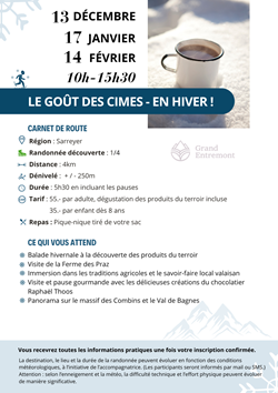 Cet hiver, Francine Vogt vous emmène à Sarreyer pour une sortie où l’on découvre, goûte et vit le Grand Entremont.